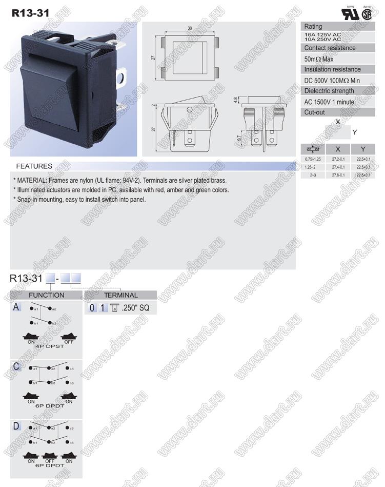 Каталог > Электронные компоненты, радиодетали > Переключатели, кнопки > Переключатели клавишные (ROCKER) > R13 серия > R13-31 серия > R13-31C-01