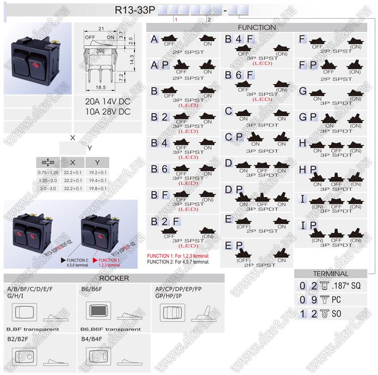 Каталог > Электронные компоненты, радиодетали > Переключатели, кнопки > Переключатели клавишные (ROCKER) > R13 серия > R13-33P серия > R13-33PB2B2F-02