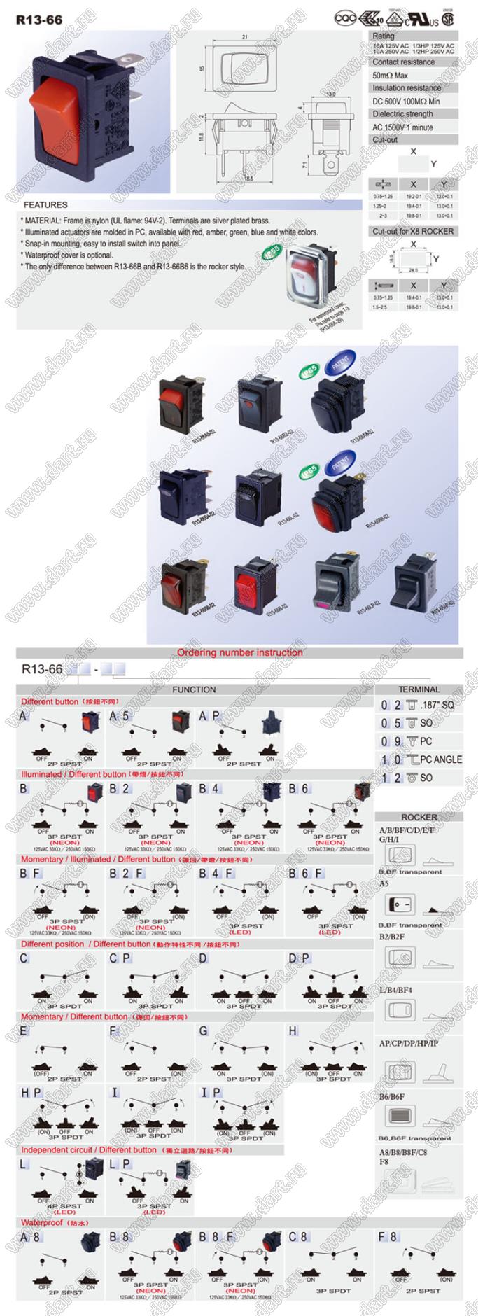 Каталог > Электронные компоненты, радиодетали > Переключатели, кнопки > Переключатели клавишные (ROCKER) > R13 серия > R13-66 серия > R13-66B6-02