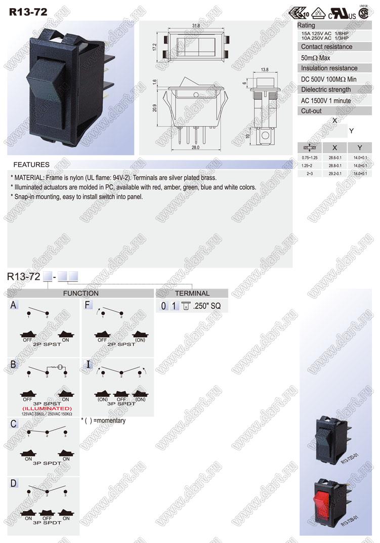 Каталог > Электронные компоненты, радиодетали > Переключатели, кнопки > Переключатели клавишные (ROCKER) > R13 серия > R13-72 серия > R13-72B-01-G