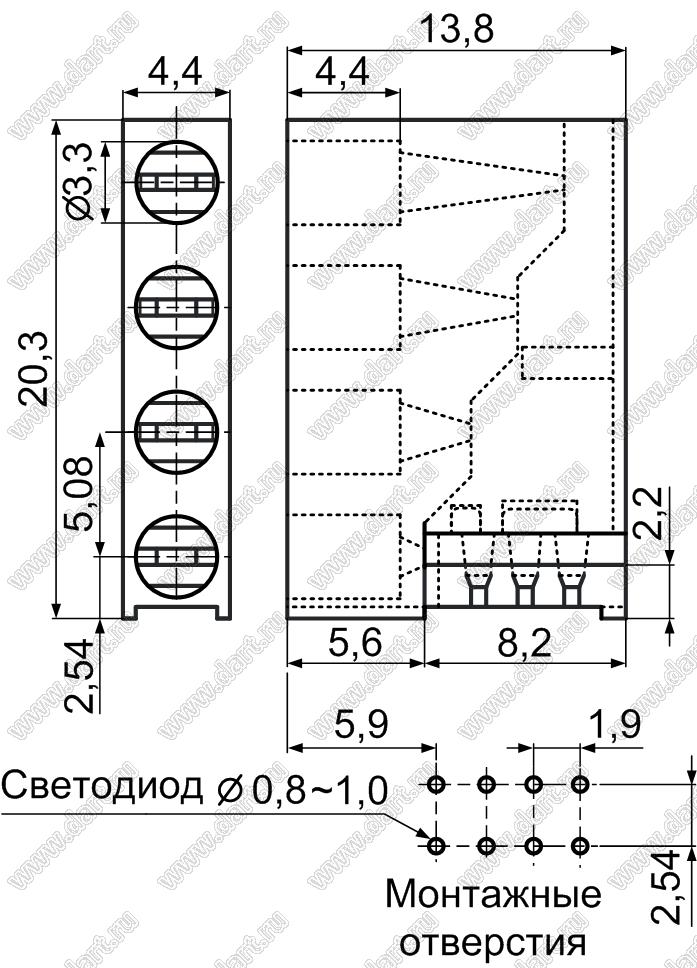 Каталог > Фурнитура для электронных устройств > Держатели и изоляторы компонентов > Держатели светодиодов > Держатели светодиодов угловые на плату > 4 x d=3,0мм > KLH-341