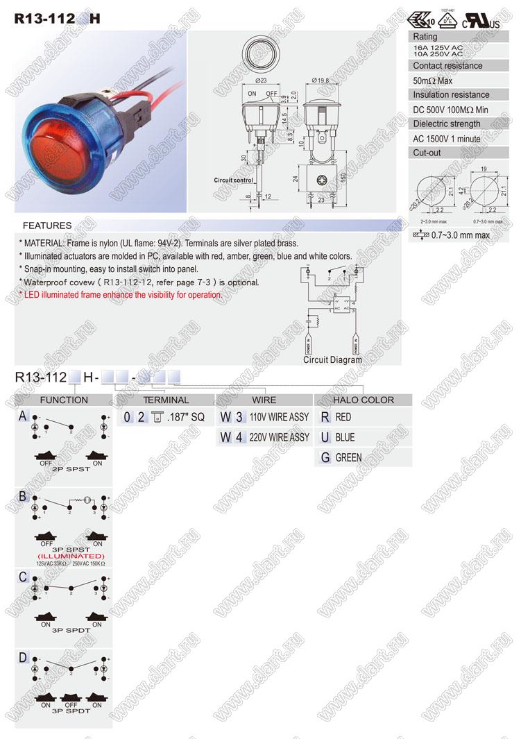 Каталог > Электронные компоненты, радиодетали > Переключатели, кнопки > Переключатели клавишные (ROCKER) > R13 серия > R13-112xH серия > R13-112xH-02-W4-U