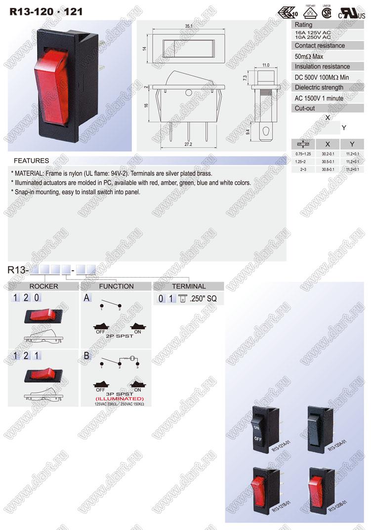 Каталог > Электронные компоненты, радиодетали > Переключатели, кнопки > Переключатели клавишные (ROCKER) > R13 серия > R13-121 серия > R13-121A-01