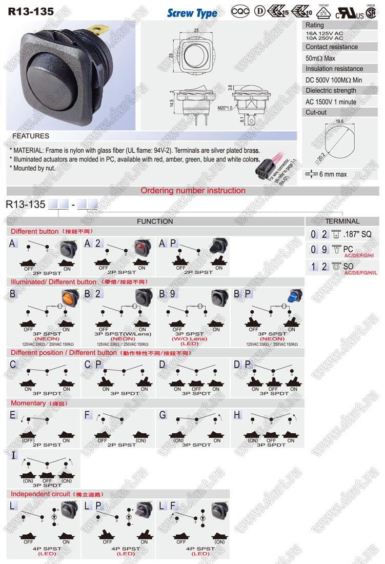 Каталог > Электронные компоненты, радиодетали > Переключатели, кнопки > Переключатели клавишные (ROCKER) > R13 серия > R13-135 серия > R13-135A2-02