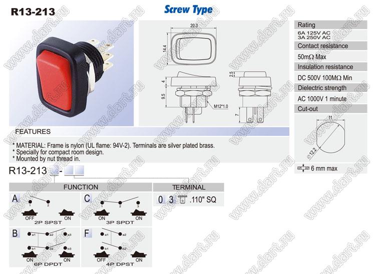 Каталог > Электронные компоненты, радиодетали > Переключатели, кнопки > Переключатели клавишные (ROCKER) > R13 серия > R13-213 серия > R13-213A-03