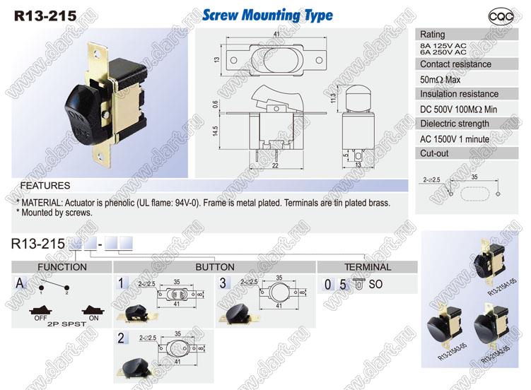 Каталог > Электронные компоненты, радиодетали > Переключатели, кнопки > Переключатели клавишные (ROCKER) > R13 серия > R13-215 серия > R13-215A3-05