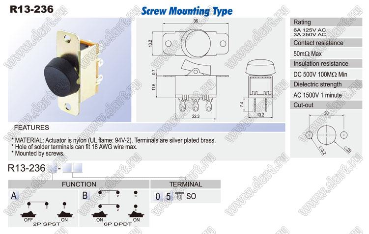 Каталог > Электронные компоненты, радиодетали > Переключатели, кнопки > Переключатели клавишные (ROCKER) > R13 серия > R13-236 серия > R13-236A-05