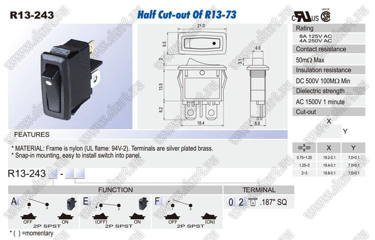 Каталог > Электронные компоненты, радиодетали > Переключатели, кнопки > Переключатели клавишные (ROCKER) > R13 серия > R13-243 серия > R13-243A-02