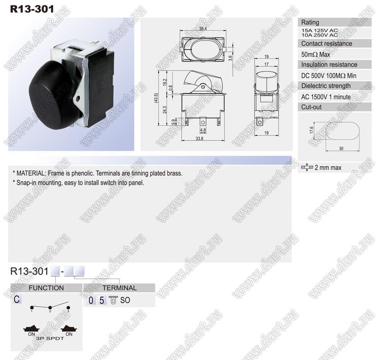 Каталог > Электронные компоненты, радиодетали > Переключатели, кнопки > Переключатели клавишные (ROCKER) > R13 серия > R13-301 серия > R13-301C-05