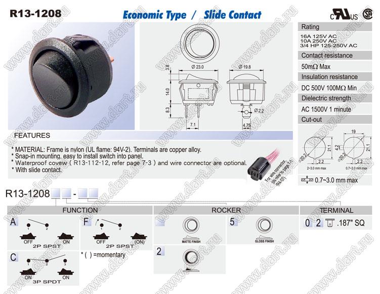 Каталог > Электронные компоненты, радиодетали > Переключатели, кнопки > Переключатели клавишные (ROCKER) > R13 серия > R13-1208 серия > R13-1208A-02