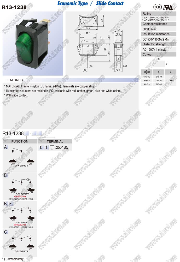 Каталог > Электронные компоненты, радиодетали > Переключатели, кнопки > Переключатели клавишные (ROCKER) > R13 серия > R13-1238 серия > R13-1238B-01