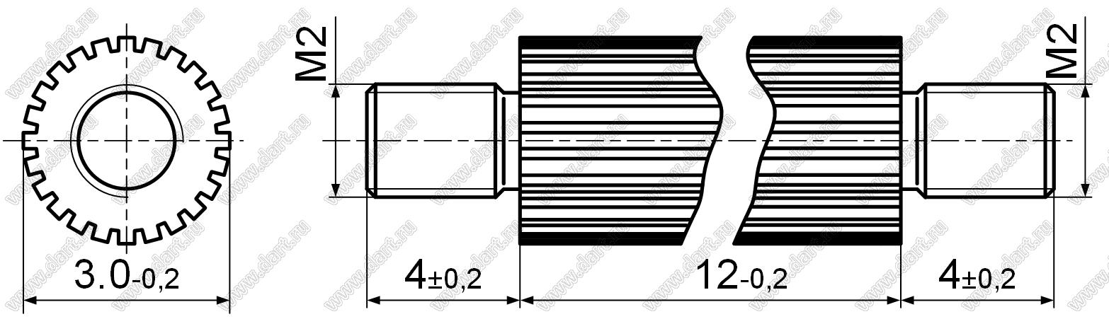 стойка цилиндрическая с накаткой и внешними резьбами; резьба М2x0,4; латунь; L=12мм