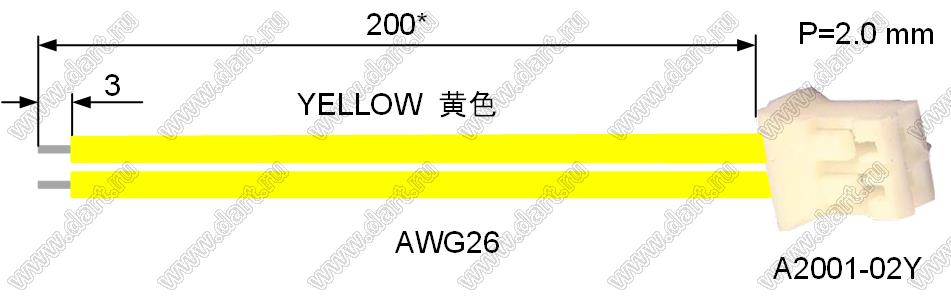 Розетка однорядня, шаг 2,0 мм, 2 контакта с желтыми проводами длиной 200мм