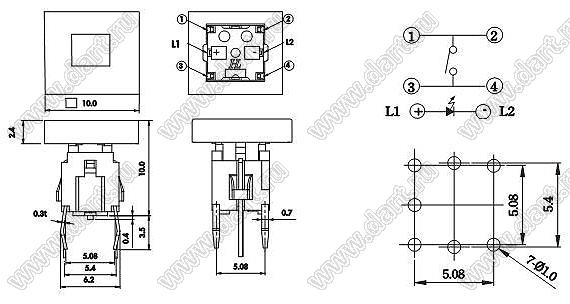 Каталог > Электронные компоненты, радиодетали > Переключатели, кнопки > Переключатели тактовые (TACT, тактовые кнопки) > Тактовые кнопки прямые для монтажа в отверстия платы > Кнопки миниатюрные с подсветкой > PB6148L серия > PB6148L-1