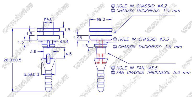 Диаметр отверстия в шасси B: 4,2 мм
