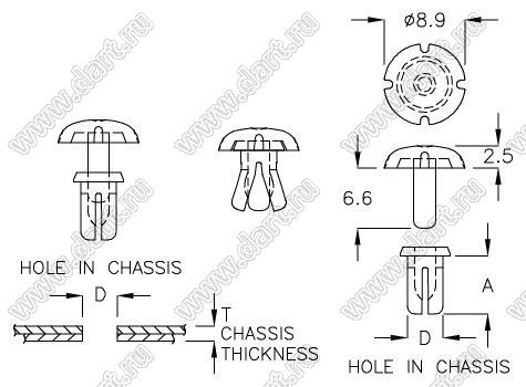 пистон монтажный; A=6,4мм; нейлон-46; черный