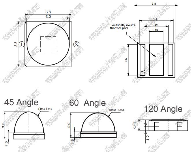 HYF38G30N36G-D1 светодиод ультрафиолетовый для поверхностного (SMD) монтажа; типоразмер 3838; 365...370нм; 3,4...3,8V; P=500...600мВт; 636мВт/ср; 120°; Pd=3мВт
