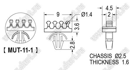 Каталог > Фурнитура для электронных устройств > Крепеж проводов и кабелей > Зажимы проводов с фиксацией в панель на защелках > MUT серия > MUT-11-1