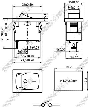 Переключатель клавишный ON-OFF; 21,0х15,0мм; 6A 250VAC/10A 125VAC; толкатель черный/корпус черный; без подсветки; маркировка "O I"; терминалы 4,8x0,8мм