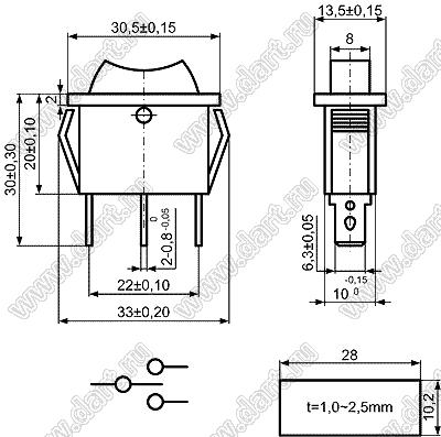 Переключатель клавишный ON-OFF-ON; 30,5х13,5мм; 15A/30A 250VAC; толкатель черный/корпус черный; без подсветки; маркировка "I O II"; терминалы 6,3x0,8мм