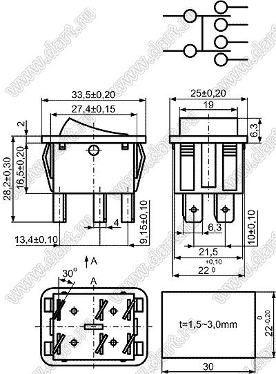 Каталог > Электронные компоненты, радиодетали > Переключатели, кнопки > Переключатели клавишные (ROCKER) > KCD4 серия > KCD4-RN-203O51BB (XW-604SB3BBB6C)