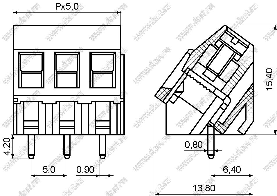 Каталог > Электронные компоненты, радиодетали > Клеммники (колодки клеммные) > Клеммники винтовые для монтажа в отверстия печатных плат > Винтовые клеммники (шаг 5,0 мм) > KF103-5.0 (DG103-5.0) серия > KF103-5.0-03P-14