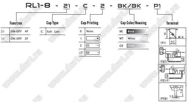 Каталог > Электронные компоненты, радиодетали > Переключатели, кнопки > Переключатели клавишные (ROCKER) > RLx серии > RL1-811-C-0-WT/BK-P1