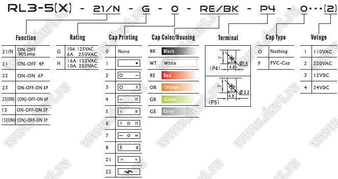 Каталог > Электронные компоненты, радиодетали > Переключатели, кнопки > Переключатели клавишные (ROCKER) > RLx серии > RL3-5(X)21-G-0-BK/BK-P4