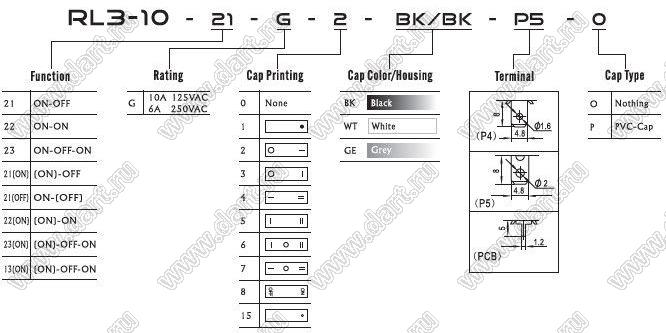 Каталог > Электронные компоненты, радиодетали > Переключатели, кнопки > Переключатели клавишные (ROCKER) > RLx серии > RL3-10-21-G-2-BK/BK-P5