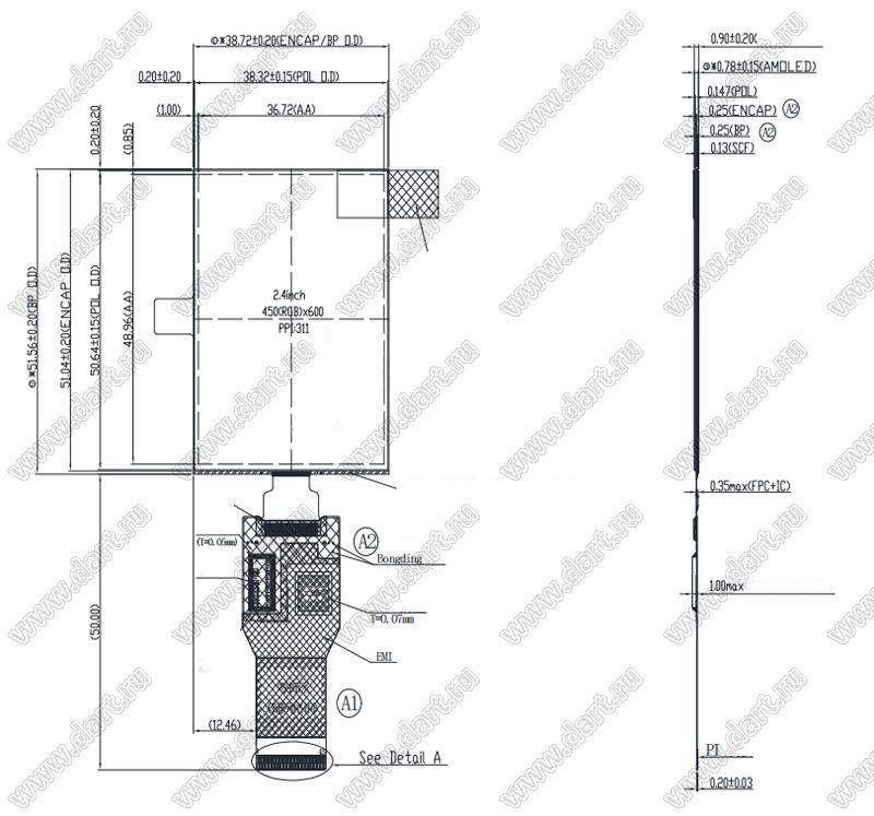 Дисплей AMOLED 2,4-дюймовый LTPS с разрешением 450x600 точек и интерфейсом SPI/MCU/MIPI; 2,4дюйм; Количество цветов 16,7M(24bit); габариты 38,72x51,56x1,00мм