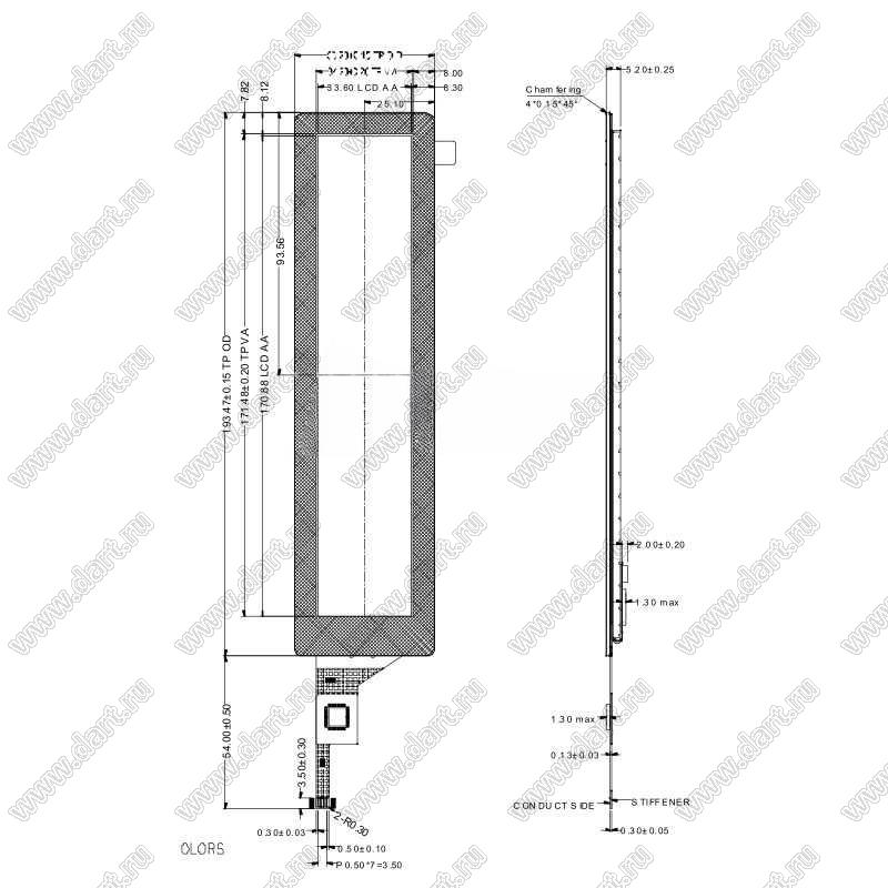 Дисплей IPS 7,0-дюймовый 280x1424 MIPI-интерфейс TFT LCD модуль с емкостной сенсорной панелью; 7,0дюйм; Количество цветов 16,7M; габариты 50,20x193,47x5,20мм