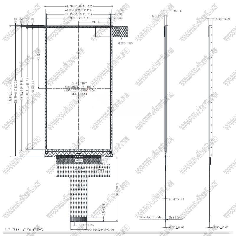 Дисплей IPS с диагональю экрана 4,0 дюйма 400x960 ST7701S, 2-полосный MIPI-интерфейс, полный угол обзора, IPS LCD; 4,0дюйм; Количество цветов 65K/262K/16,7M; габариты 42,50x102,08x2,02мм