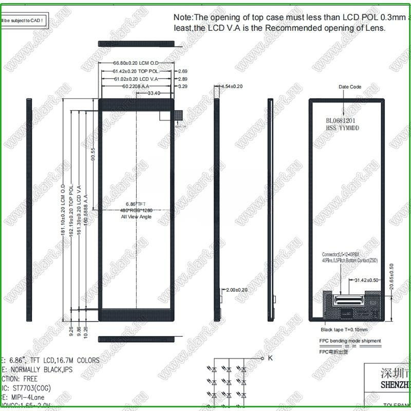 Дисплей IPS 6,8-дюймовый 4-полосный ЖК-дисплей MIPI с разрешением 480x1280 пикселей, с полным углом обзора; 6,8дюйм; Количество цветов 16,7M; габариты 66,80x181,10x4,54мм