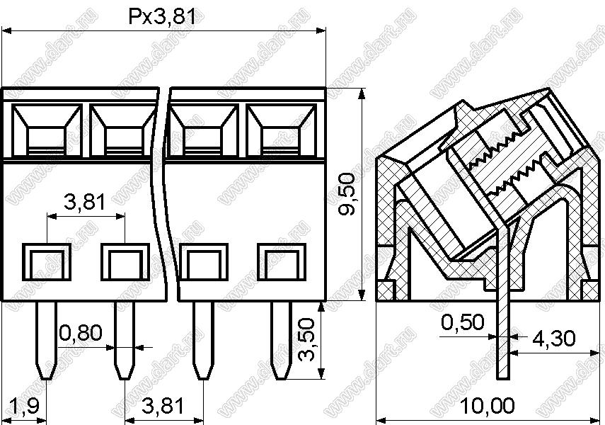 Каталог > Электронные компоненты, радиодетали > Клеммники (колодки клеммные) > Клеммники винтовые для монтажа в отверстия печатных плат > Винтовые клеммники (шаг 3,81 мм) > KF127S-3.81 серия > KF127S-3.81-03P-14