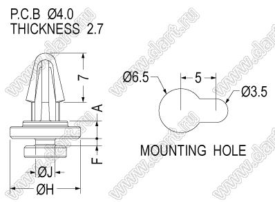 Фиксатор платы с защелкой под фигурное отверстие в шасси; A=2,5мм; B=7,0мм; F=1,0мм; ØH=10,0мм; ØJ=2,8мм; E=2,7мм; dп=4,0мм; нейлон-66 (UL); натуральный