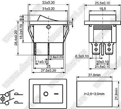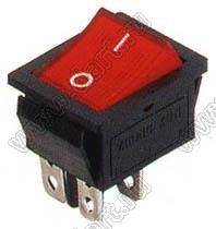 Переключатель клавишный (ON)-ON; 31,0х25,5мм; 15A/30A 250VAC; толкатель красный/корпус черный; с подсветкой; маркировка "O I"; терминалы 6,3x0,8мм