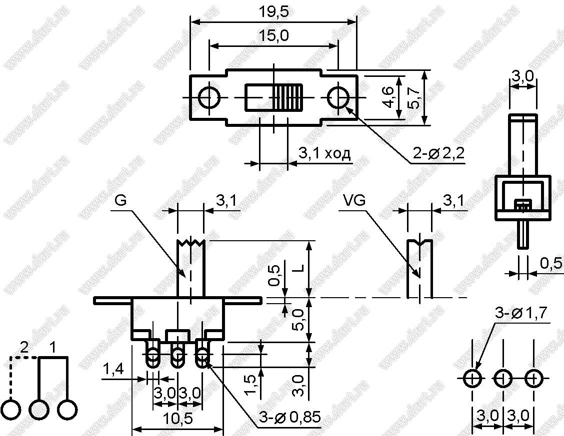 Каталог > Электронные компоненты, радиодетали > Переключатели, кнопки > Переключатели движковые (SLIDE) > Переключатели движковые (SLIDE) прямые > SS-12F15-G4