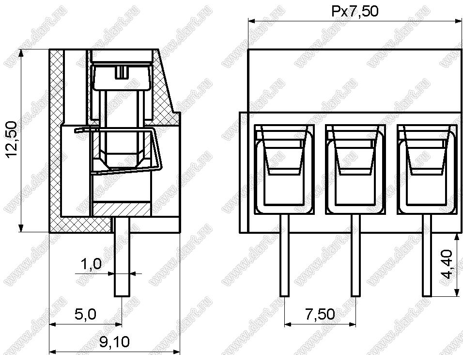 Каталог > Электронные компоненты, радиодетали > Клеммники (колодки клеммные) > Клеммники винтовые для монтажа в отверстия печатных плат > Винтовые клеммники (шаг 7,5 мм) > KF375-7.5 серия > KF375-7.5-03P-12