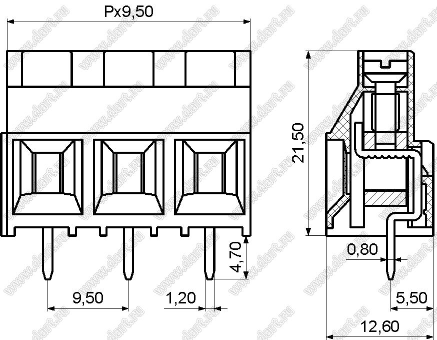 Каталог > Электронные компоненты, радиодетали > Клеммники (колодки клеммные) > Клеммники винтовые для монтажа в отверстия печатных плат > Винтовые клеммники (шаг 9,50 мм) > KF950-9.5 (DG950-9.5) серия > KF950-9.5-03P-14