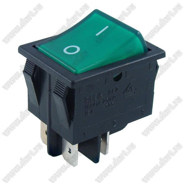 Переключатель клавишный ON-OFF; 31,0х25,5мм; 15A/30A 250VAC; толкатель зеленый/корпус черный; с подсветкой; маркировка "O I"; терминалы 6,3x0,8мм
