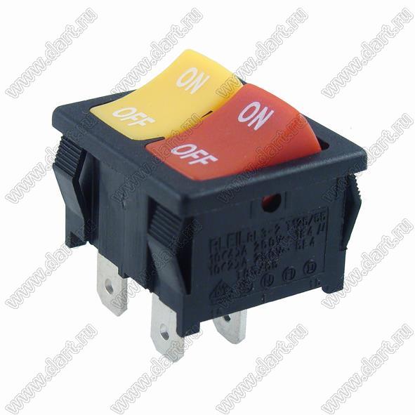 Переключатель клавишный ON-OFF; 21,0х24,3мм; 6A/12A 250VAC; толкатель красный-желтый/корпус черный; без подсветки; маркировка "O I"; терминалы 4,8x0,8мм