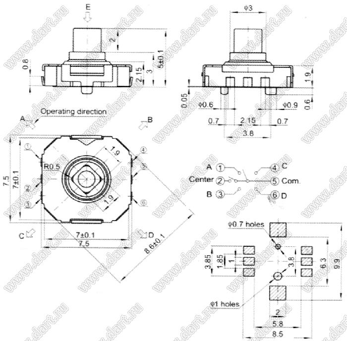 кнопка тактовая 7,5x7,5мм четырехнаправленная с центральным нажатием ("микроджойстик") для поверхностного монтажа