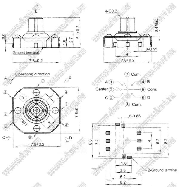 кнопка тактовая 7,8x7,8мм четырехнаправленная с центральным нажатием ("микроджойстик") для поверхностного монтажа