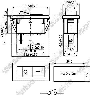 Переключатель клавишный ON-OFF; 32,5х16,0мм; 15A/30A 250VAC; толкатель красный/корпус белый; без подсветки; маркировка "O I"; терминалы 4,8x0,6мм