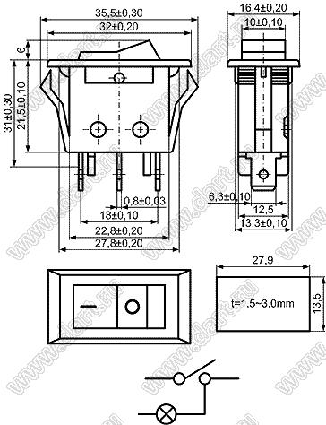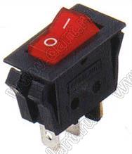 Переключатель клавишный ON-OFF; 32,0х16,4мм; 15A/30A 250VAC; толкатель красный/корпус черный; с подсветкой; маркировка "O I"; терминалы 6,3x0,8мм
