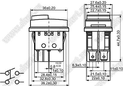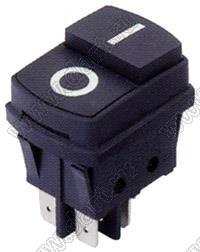 Переключатель клавишный ON-OFF; 36,0х27,6мм; 16A 250VAC/20A 125VAC; толкатель черный/корпус черный; без подсветки; маркировка "O I"; терминалы 6,3x0,8мм
