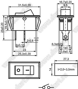 Переключатель клавишный ON-OFF; 31,5х16,7мм; 6A/250VAC/10A 125VAC; толкатель красный/корпус черный; без подсветки; маркировка "O I"; терминалы 6,3x0,8мм