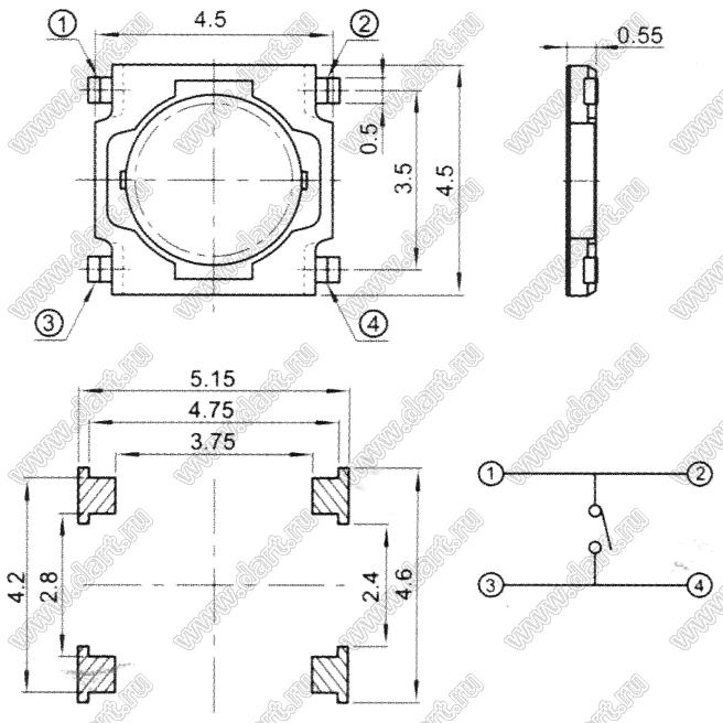 Каталог > Электронные компоненты, радиодетали > Переключатели, кнопки > Переключатели тактовые (TACT, тактовые кнопки) > Тактовые кнопки SMD (для поверхностного монтажа) > 4,5x4,5 мм > TVCM09 > TVCM09