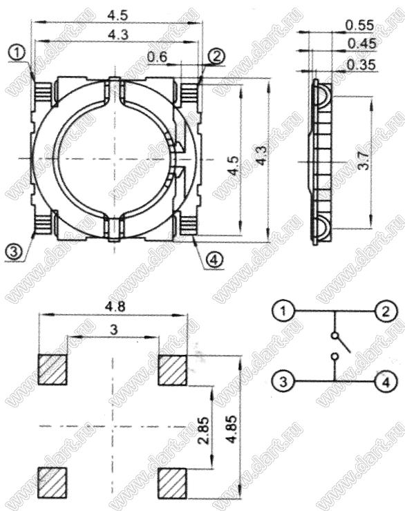Каталог > Электронные компоненты, радиодетали > Переключатели, кнопки > Переключатели тактовые (TACT, тактовые кнопки) > Тактовые кнопки SMD (для поверхностного монтажа) > 4,5x4,5 мм > TVCM10 > TVCM10