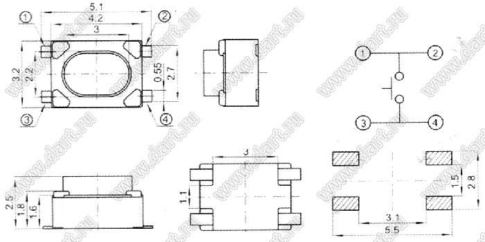Каталог > Электронные компоненты, радиодетали > Переключатели, кнопки > Переключатели тактовые (TACT, тактовые кнопки) > Тактовые кнопки SMD (для поверхностного монтажа) > 3,2x4,2 мм > TVAF11 > TVAF11